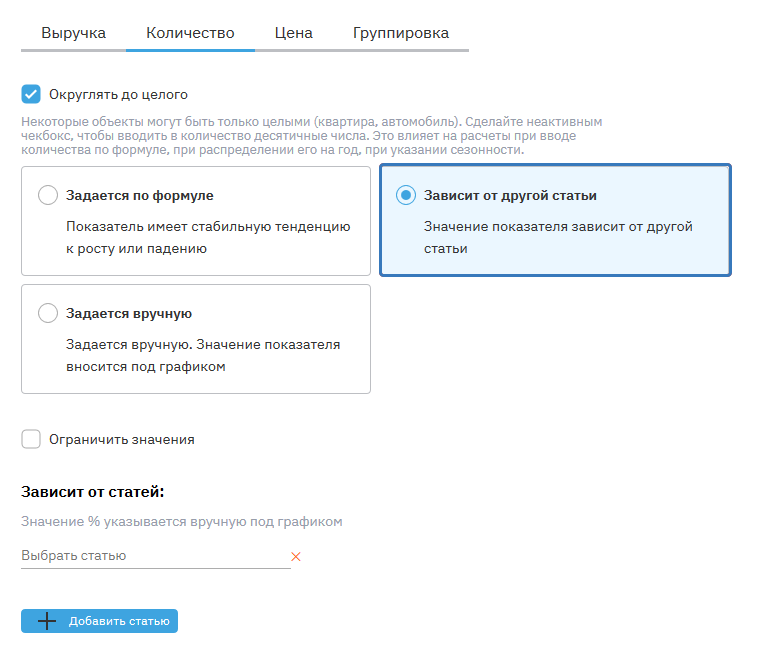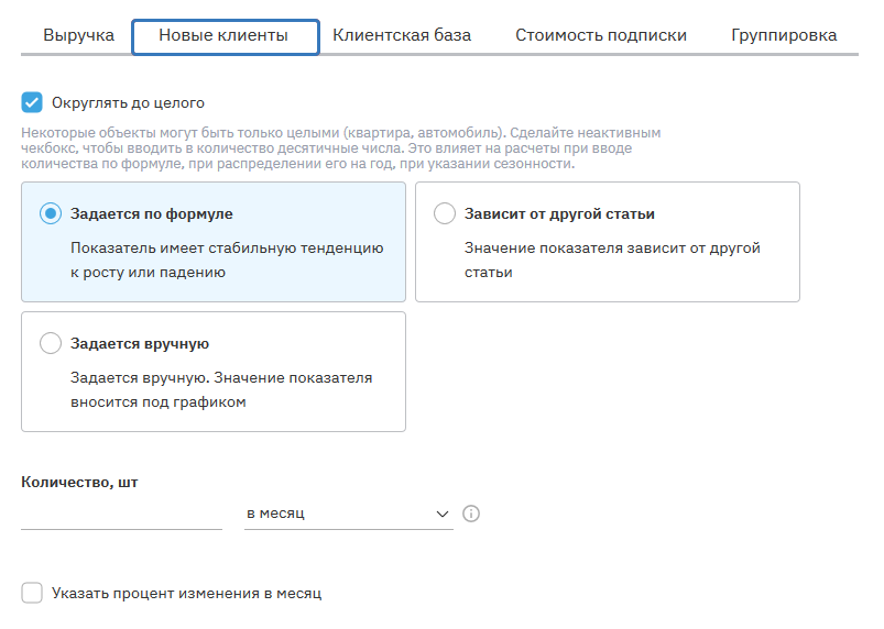 1. Некоторые объекты могут быть только целыми (квартира, автомобиль или, например, вы продаете цветы, и чтобы в плане не было, что в день продается 10,75 розы, то необходимо поставить галочку, и в плане будет указано 11 роз. Сделайте неактивным чекбокс, чтобы вводить в количество десятичные числа. Это влияет на расчёты при вводе количества по формуле, при распределении его на год, при указании сезонности.
