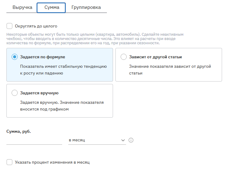 • Если показатель имеет тенденцию к росту или падению, то поставьте галку напротив поля «Указать процент изменения в месяц» и укажите процент.
