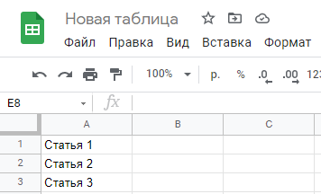 Затем напишите в таблице Excel в столбик название статей, которые хотите добавить: