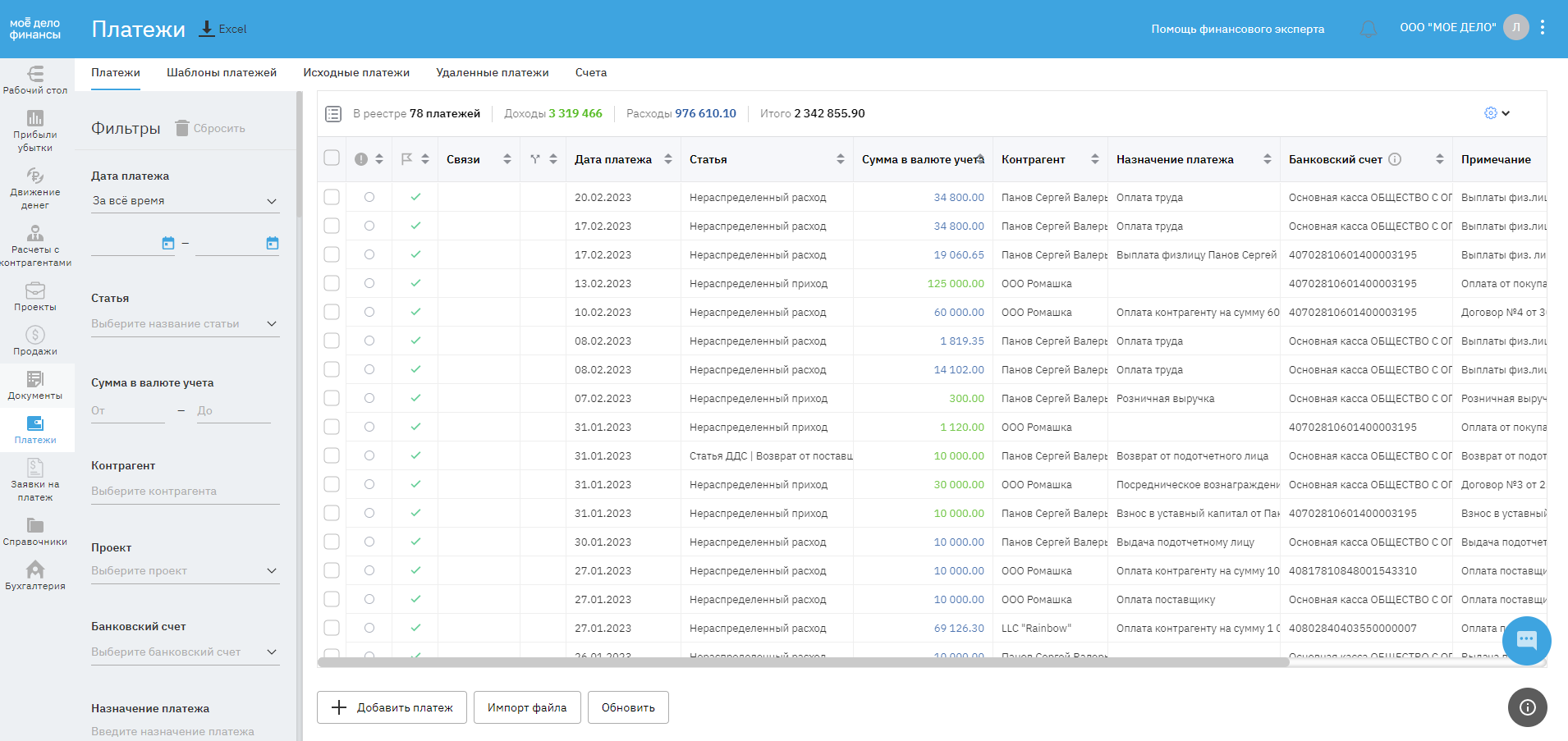- основного меню, где находятся отчеты и реестры: (аналитика, прибыли и убытки, движение денег, контрагенты, документы, платежи, счета, справочники;