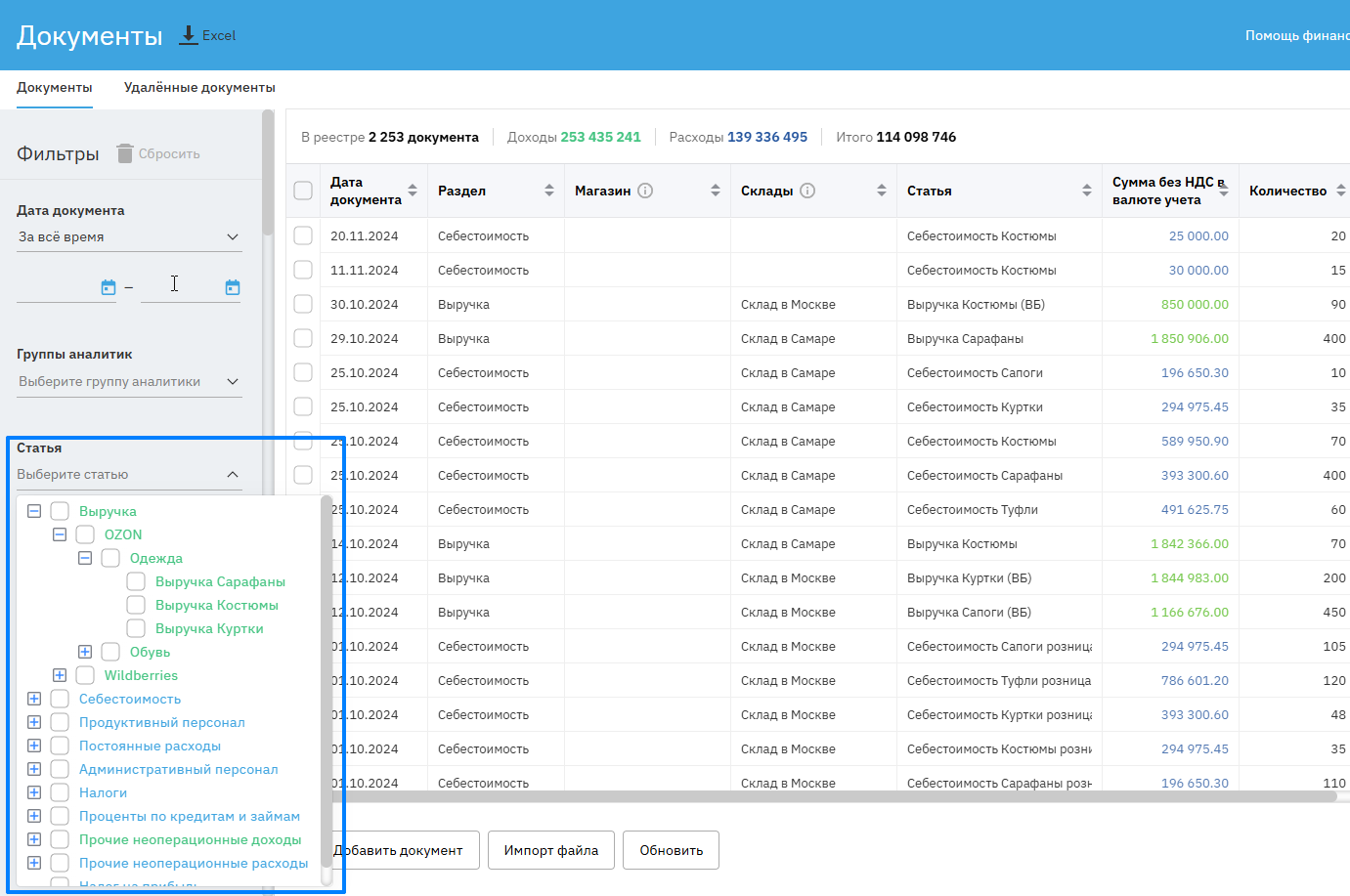 В реестрах документов, платежей и заявок теперь можно фильтровать статьи по папками или по разделам. Это ускоряет навигацию и облегчает работу с большими объёмами данных.