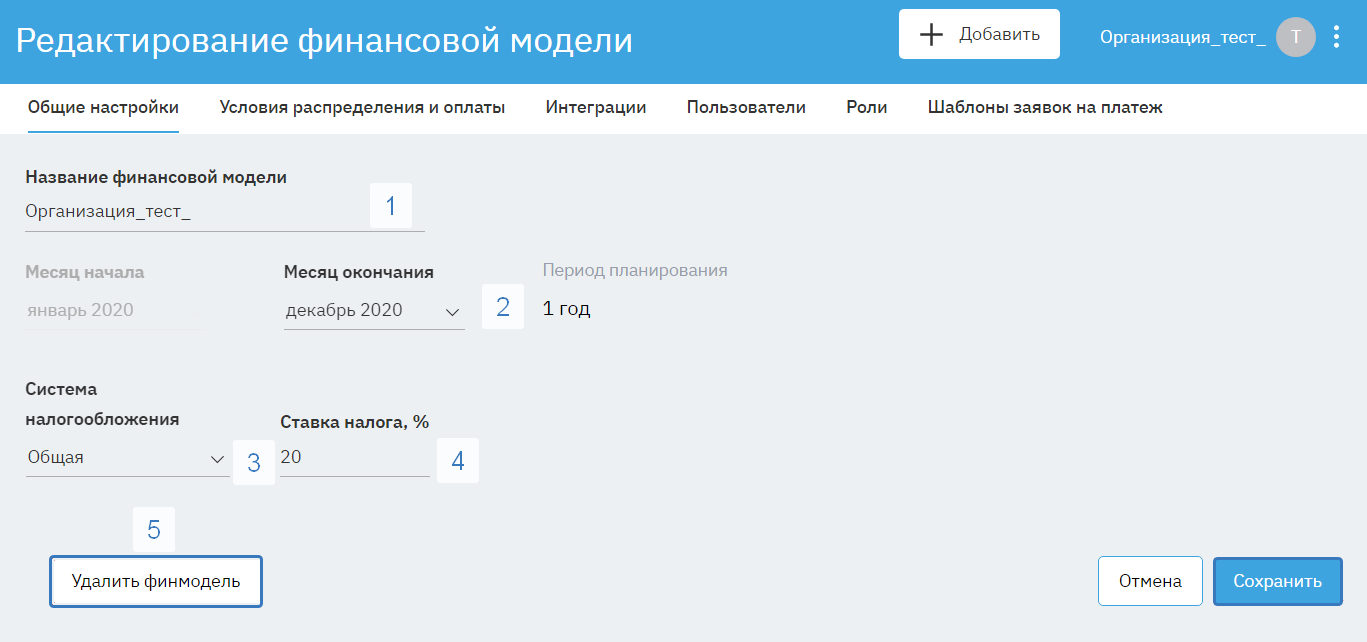 В меню «Общие настройки» можно «Удалить финмодель» нажатием на соответствующую кнопку (5), данное действие необходимо будет подтвердить нажатием на кнопку «Удалить».