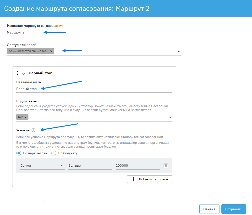 Редактировать и создавать шаблоны согласования заявок могут администратор фин. модели и пользователи, в чьей роли есть возможность изменения и создания маршрутов.