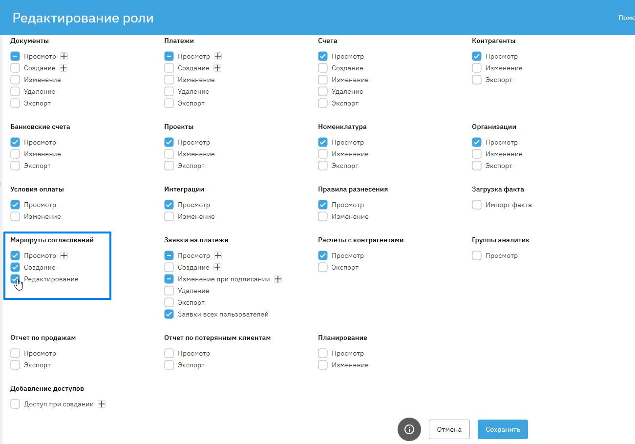 Для того чтобы предоставить пользователю возможность изменять маршруты и создавать новые, зайдите в редактирование Роли и проставьте галку в соответствующем чек-боксе: