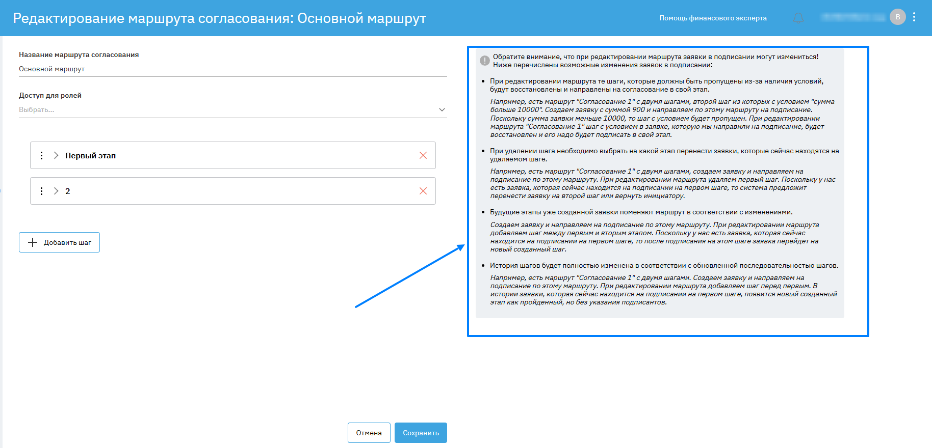 В настройках фин. модели при редактировании маршрута согласования платежей пользователь может увидеть подсказки. Они помогут сориентироваться, если порядок шагов будет изменён: