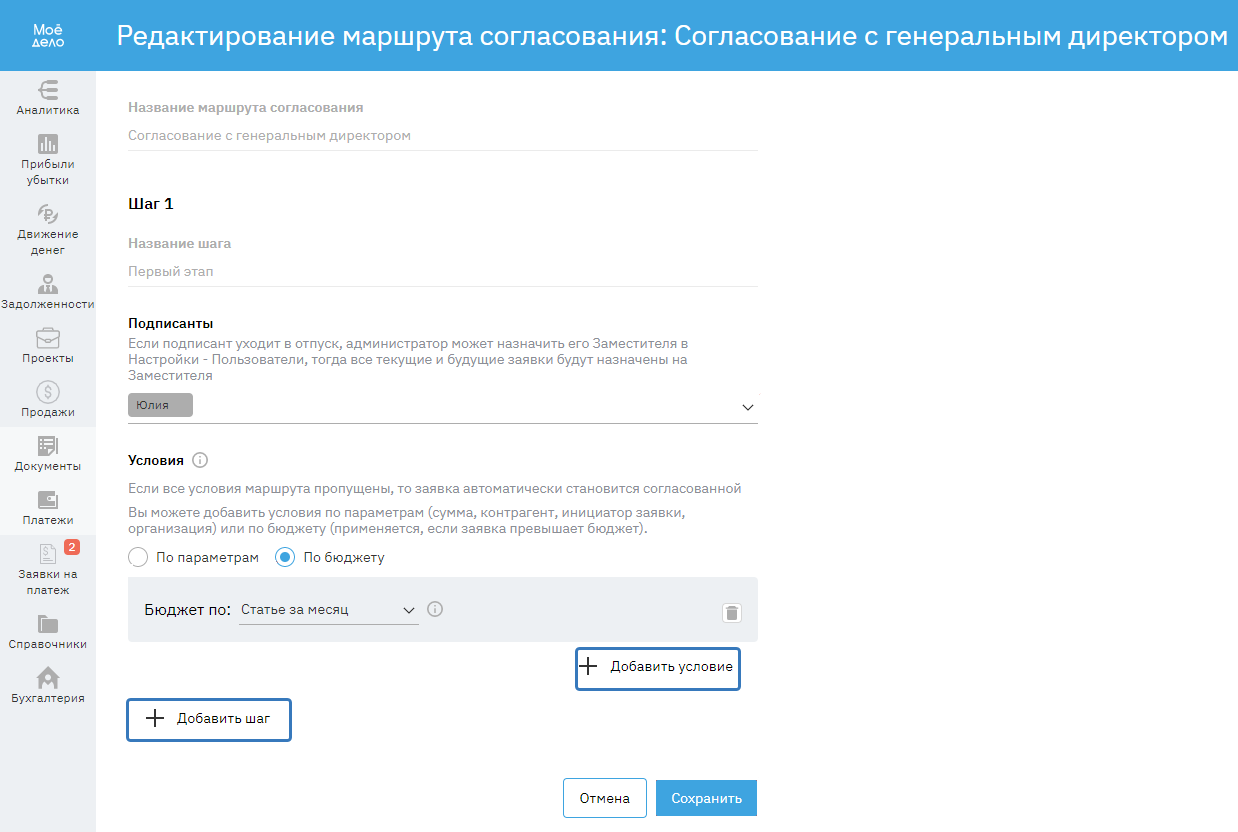 Сначала создается маршрут согласования заявки на платёж, связывая несколько пользователей по форме: Инициатор платежа – Подписант 1 – Подписант 2 – и т.д. – Согласованный платёж.