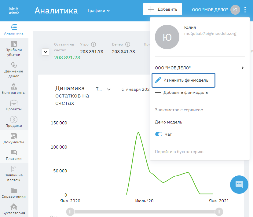 Для создания маршрута согласования заявки на платёж в правом верхнем углу нажмите на вспомогательное меню в виде трёх точек, выберите нужную финансовую модель, затем нажмите «Изменить финмодель»: