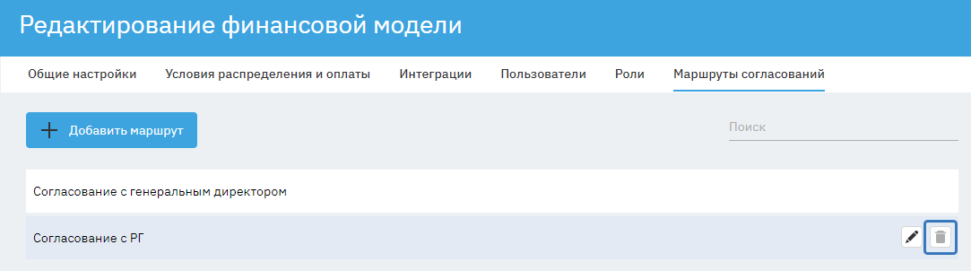 Затем переходим в раздел «Маршруты согласований». Для удаления шаблона нужно навести курсор и нажать на корзину: