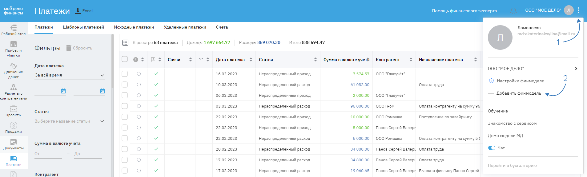 В правом верхнем углу нажмите на вспомогательное меню или три точки, выберите «+ Добавить финмодель».
