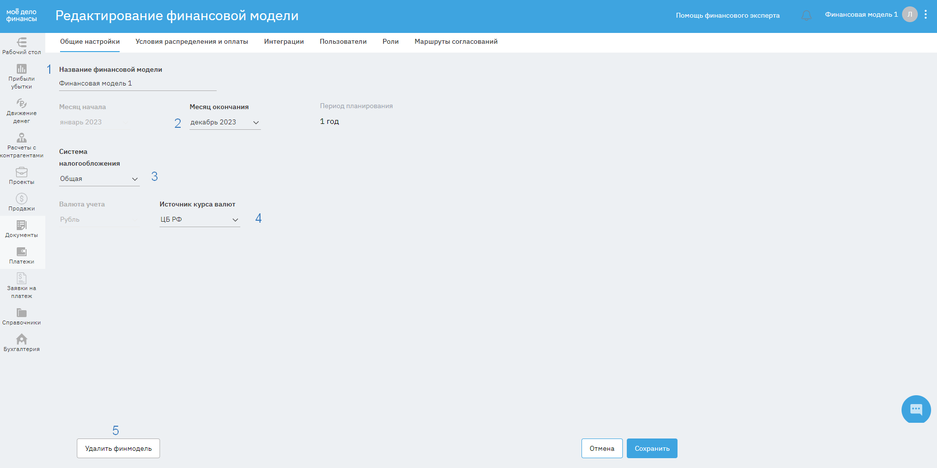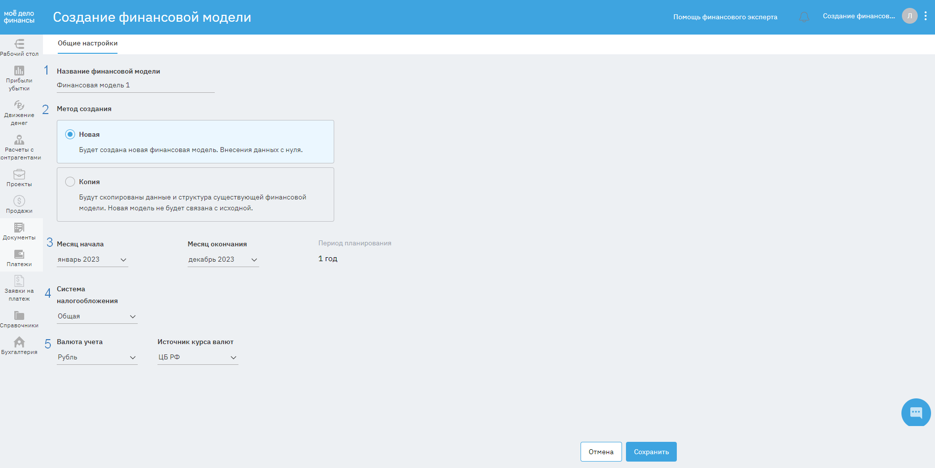 Важно: после создания финансовой модели редактирование поля «Месяц начала» будет недоступно.