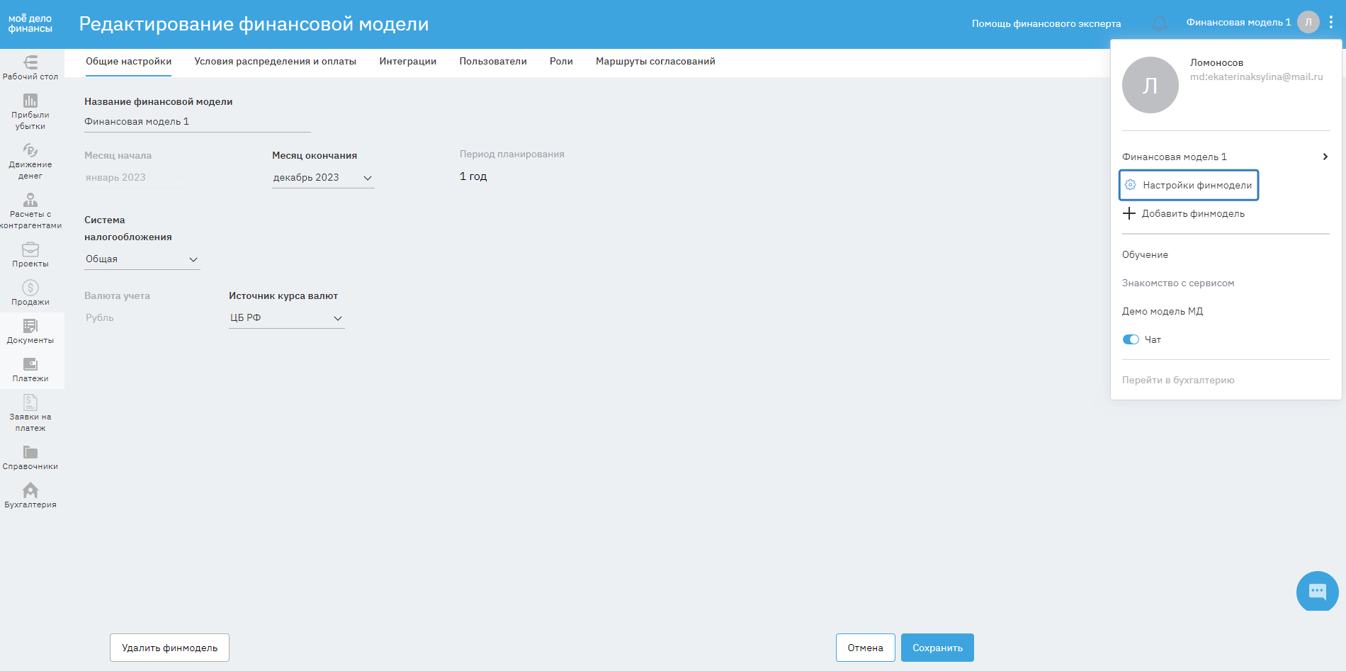 Для этого в правом верхнем углу нажмите на вспомогательное меню или три точки, выберите нужную финансовую модель, затем нажмите «Настройки финмодели‎».