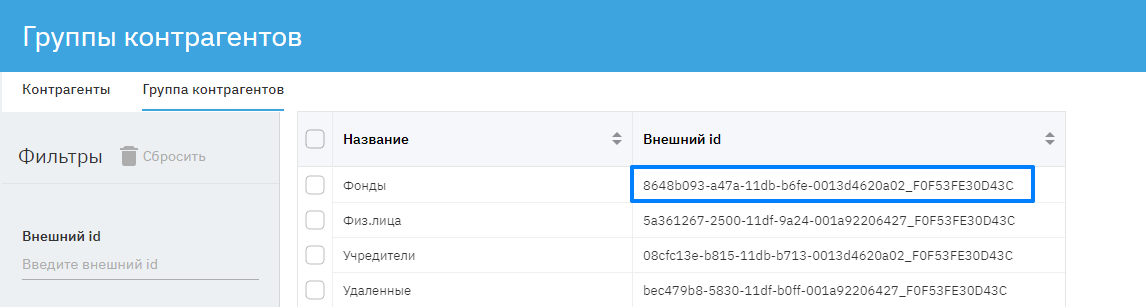 У групп контрагентов, попавших в сервис из 1С, есть Внешний ID:
