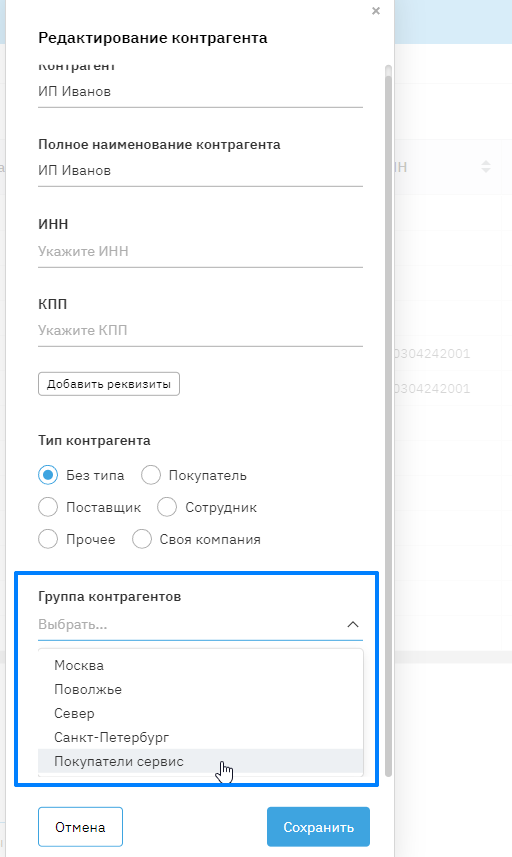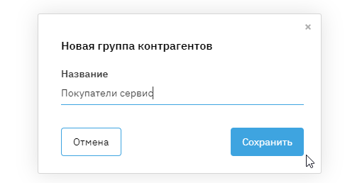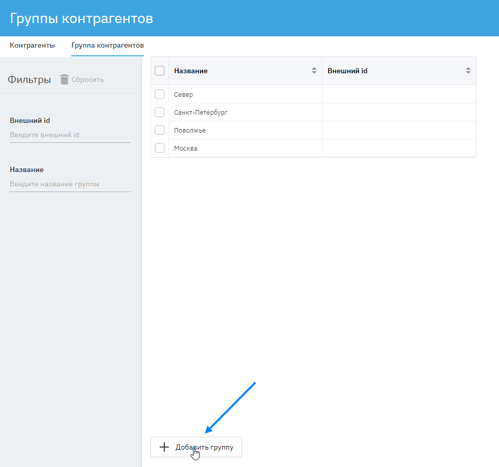 Если у вас нет интеграции с 1С, вы можете добавить группу контрагентов самостоятельно, через кнопку «Добавить группу»: