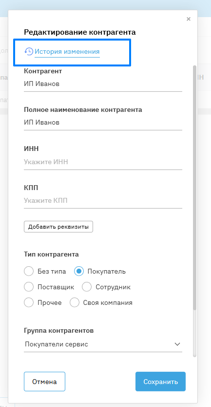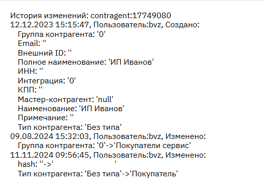 В каждой карточке контрагента есть ссылка на «Историю изменений»: