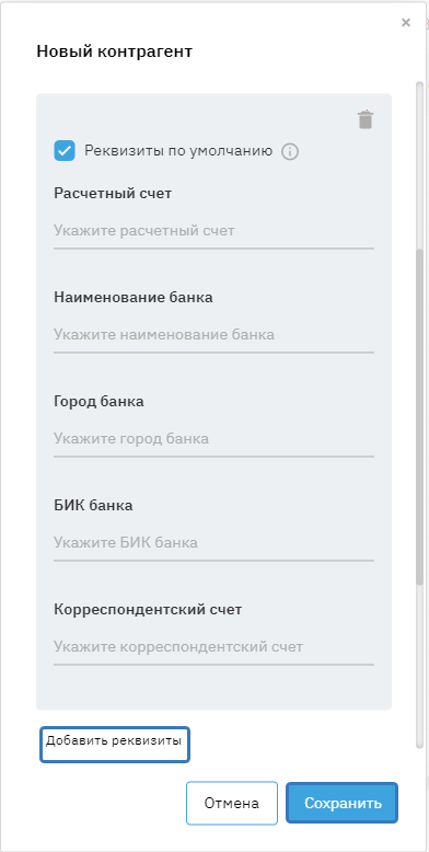 Поставьте галочку в поле «Реквизиты по умолчанию», если вы хотите эти данные сделать основными для формируемого контрагента.