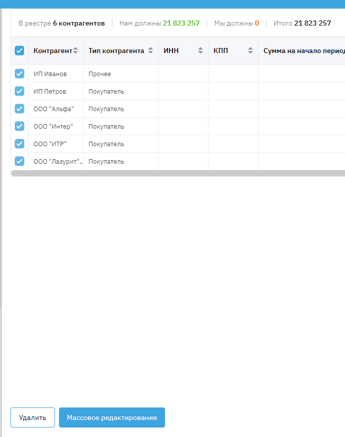 Для массовой смены Типа Контрагента выделите их галочками и нажмите кнопку «Массовое редактирование»:
