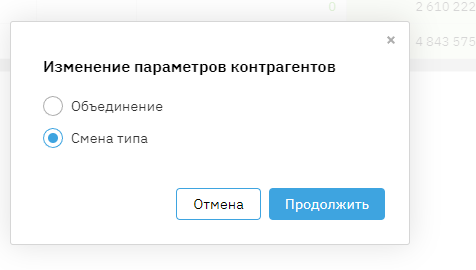 Затем нажмите «Смена типа» — «Продолжить» и выберите нужный вам вариант типа контрагента: