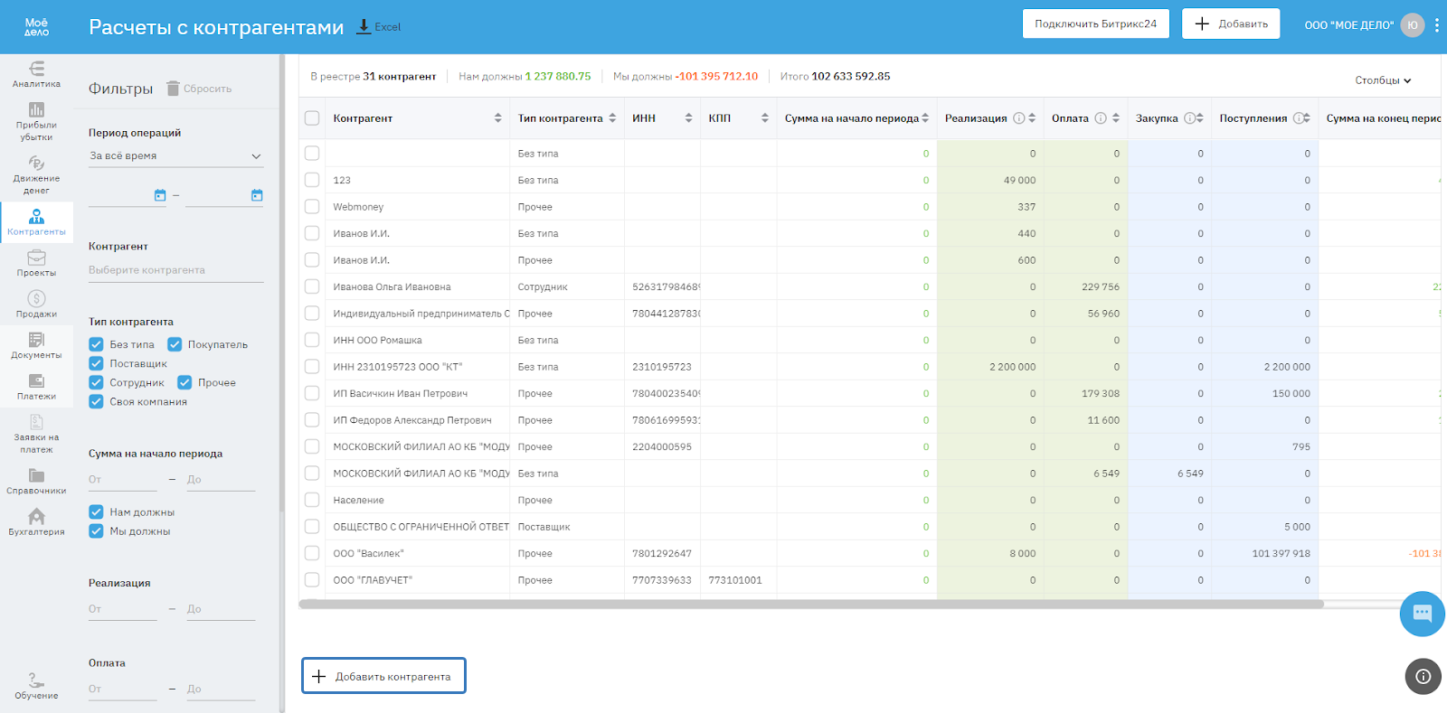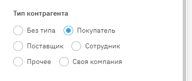 Если в вашем бизнесе несколько Юридических лиц и есть внутригрупповые обороты, выберите для таких Контрагентов тип «своя компания».