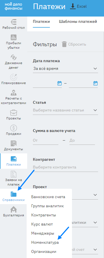 Список существующих номенклатур находится в разделе «Справочники» — «Номенклатура».
