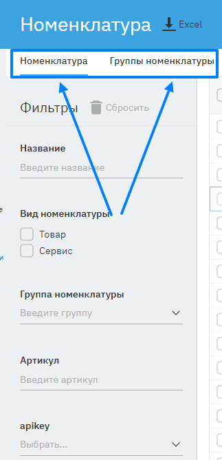 Во вкладке «Номенклатура» отображается реестр номенклатур и возможные варианты фильтров.
