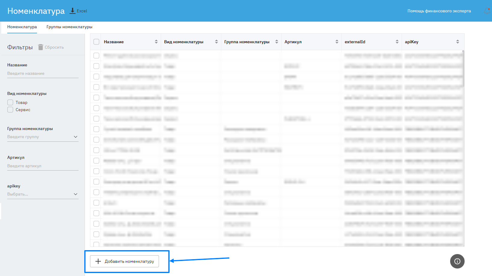 При необходимости вы можете добавить новую номенклатуру вручную, нажав кнопку «Добавить номенклатуру»: