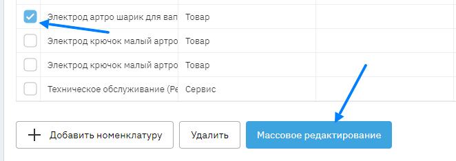 Выделив номенклатуру чек-боксом, появляется кнопка массового редактирования и возможности удалить номенклатуру: