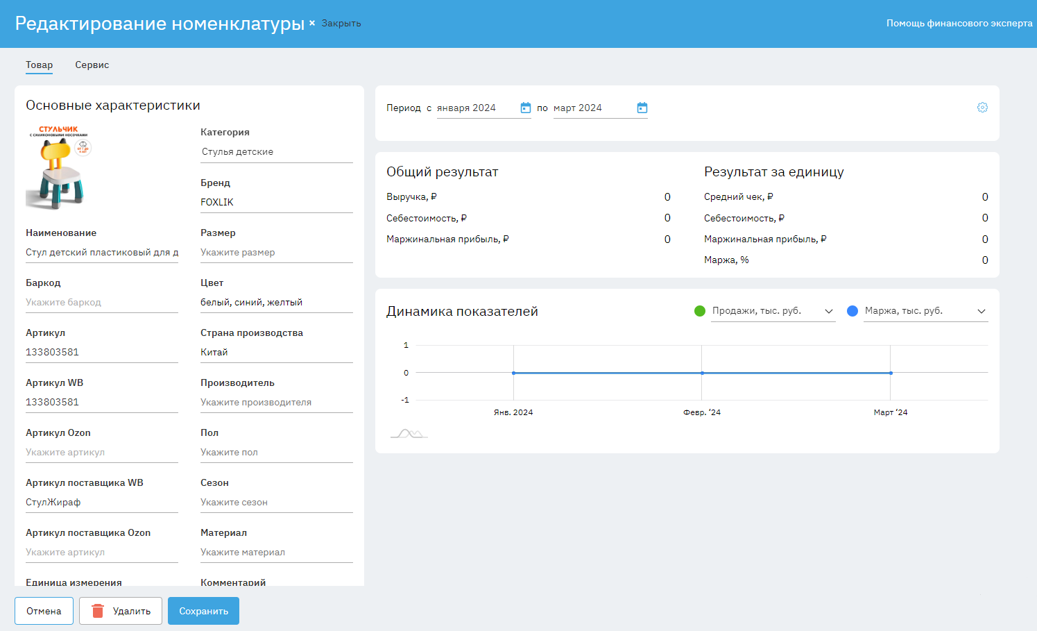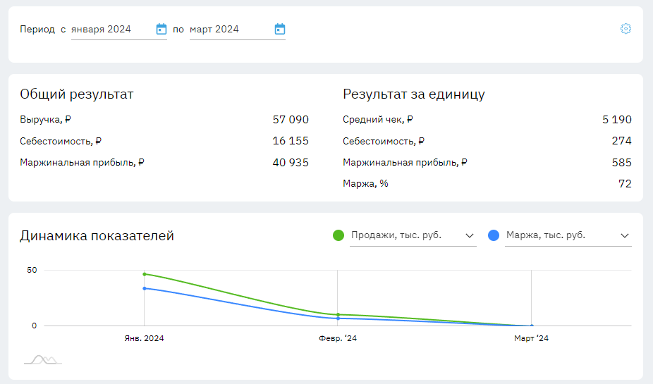 В каждой карточке номенклатуры доступна аналитика по продажам этого товара или услуги за выбранный вами период (общий результат и результат за единицу, график):
