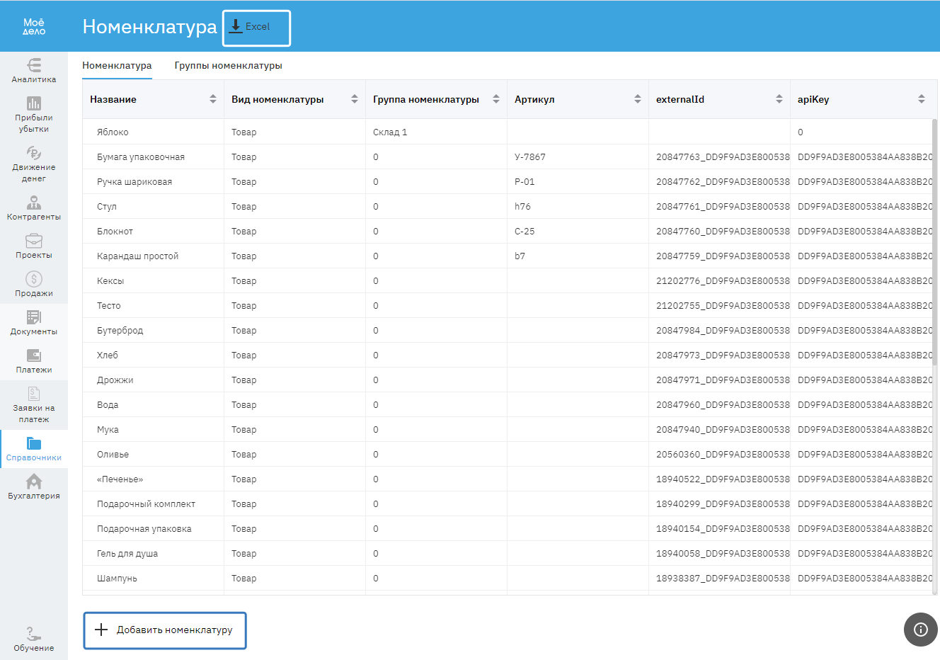 Если вы хотите выгрузить файл со списком номенклатур на свой компьютер, нажмите на кнопку «Excel».