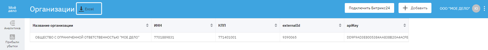 В подразделе «Организации» отражаются юридические лица, которые загружены в модель (у одной компании может быть несколько юридических лиц). Если вы хотите выгрузить файл со списком организаций на свой компьютер, нажмите на кнопку «Excel».