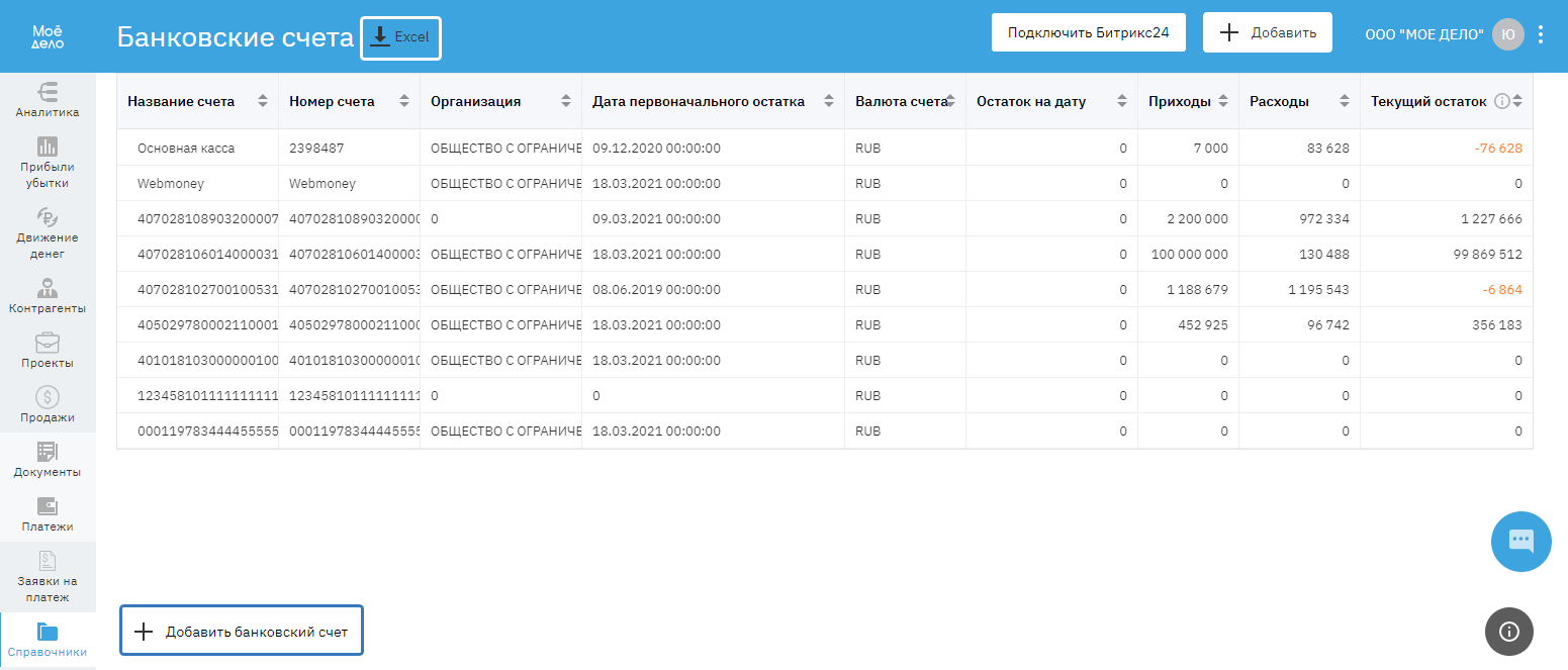 В подразделе «Банковские счета» отражаются банковские (расчётные) счета и кассы компании: текущий остаток, приходы и расходы по расчетному счету, кассе.