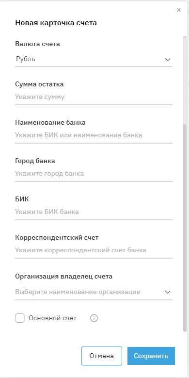 Включите галочку в строке «Основной счёт», если хотите сделать счет основным. Может выбран только один основной счет. Этот счет по умолчанию будет проставляться при создании платежа.