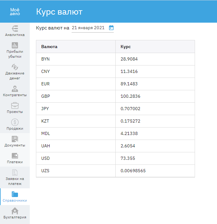 В подразделе «Курс валют» вы можете просмотреть курс нужной вам валюты на заданную дату. Чтобы выбрать дату нажмите на значок календаря.