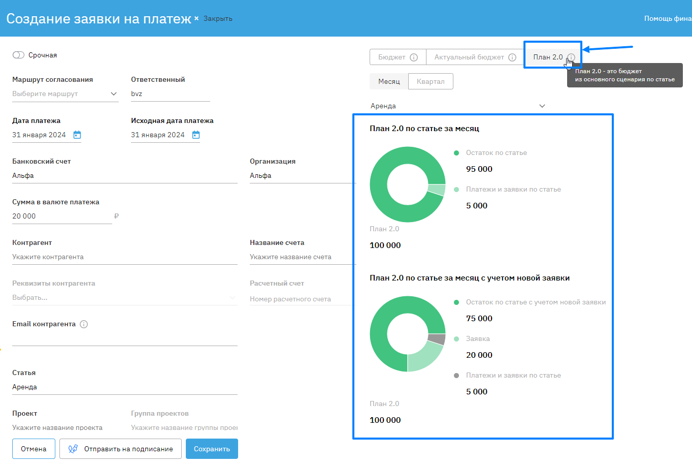 Если в настройках финансовой модели задан основной сценарий, то в заявках и платежах будет отражаться значение из «Плана 2.0»: