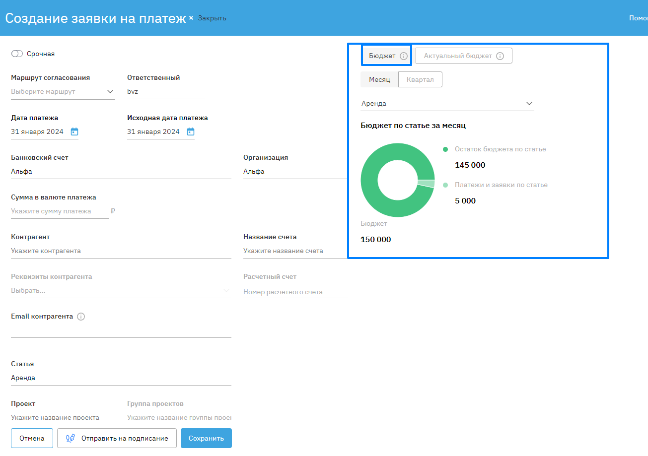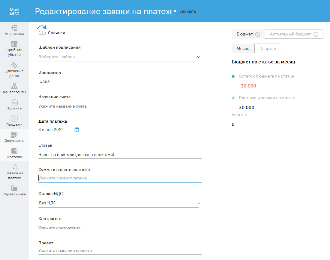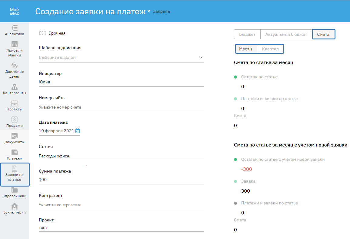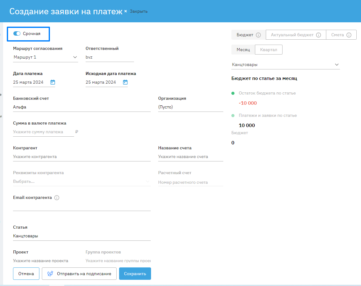 При создании заявки на платёж выберите статью и проект из выпадающего списка и укажите сумму платежа.