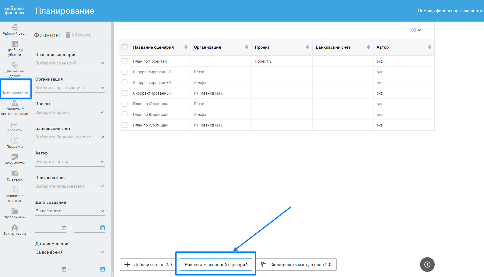 Назначить сценарий «основным» можно во вкладке Планирование. Из выпадающего списка выберите необходимый сценарий: