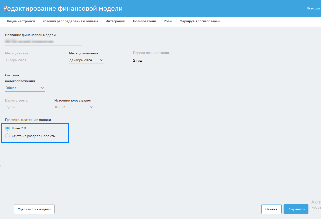 Выбрать один из вариантов отражения плановых значений при формировании заявки можно в настройках финансовой модели.