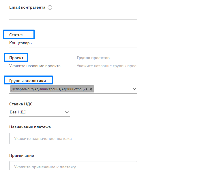 Далее заполните Статью, Проект и группы аналитик (если необходимо).