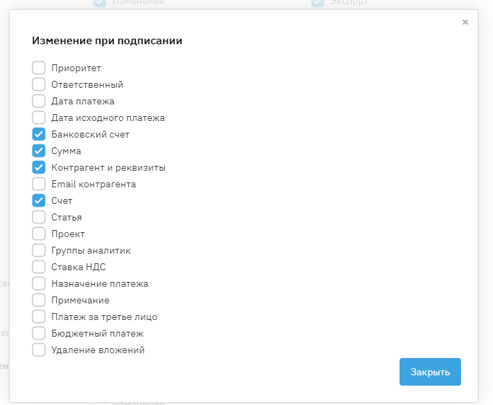 Вы можете редактировать поля: «Название счёта», «Дата платежа», «Статья», «Сумма в валюте платежа», «Ставка НДС», «Контрагент», «Проект».