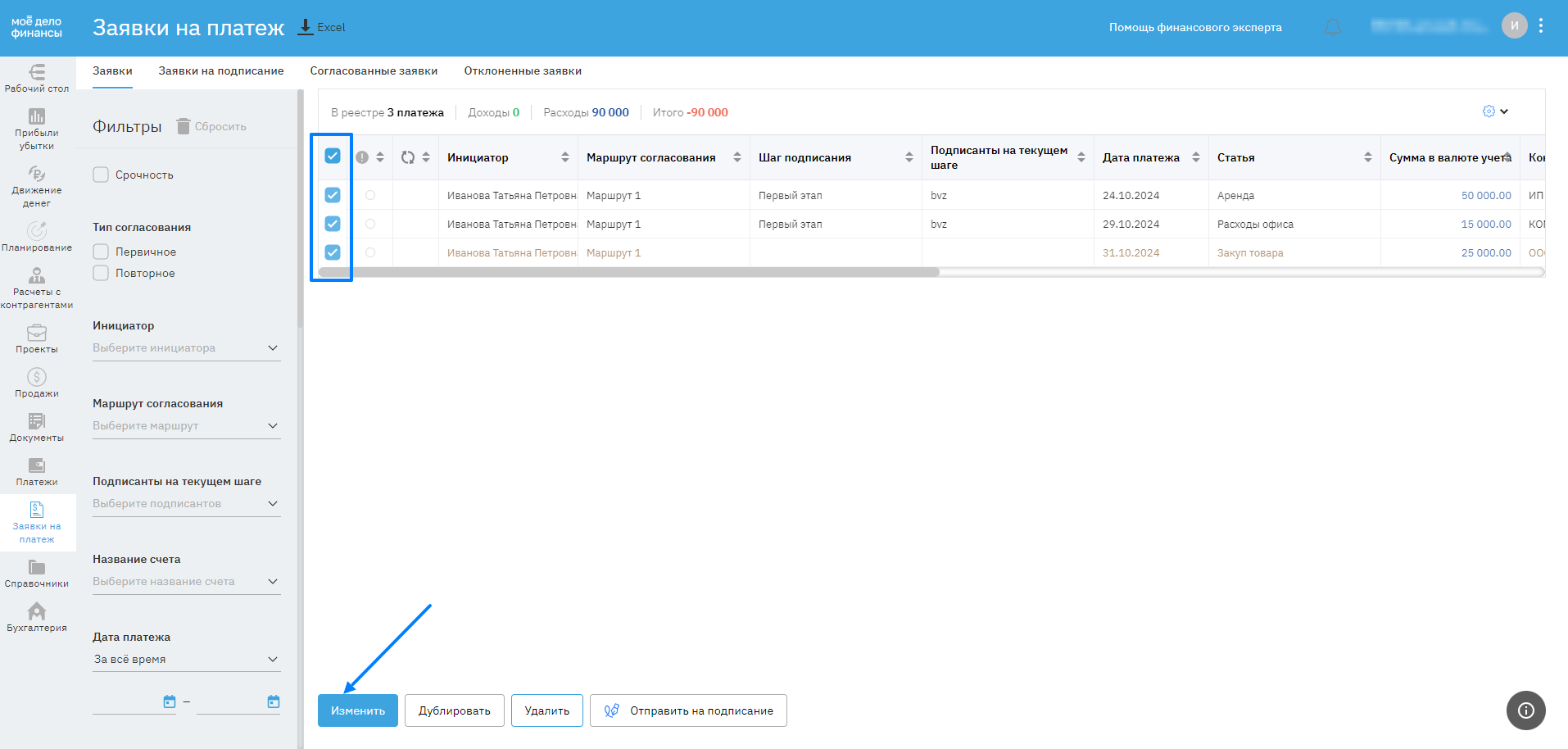 Если вы хотите отредактировать заявку на платёж, нажмите на неё двойным щелчком мыши.