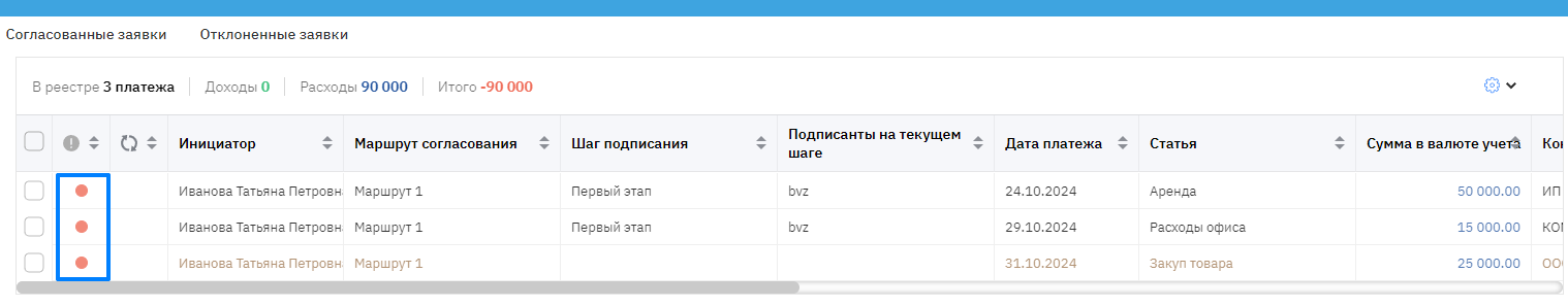 В случае, если заявка на платёж была возвращена инициатору — она появится в разделе «Отклоненные заявки».