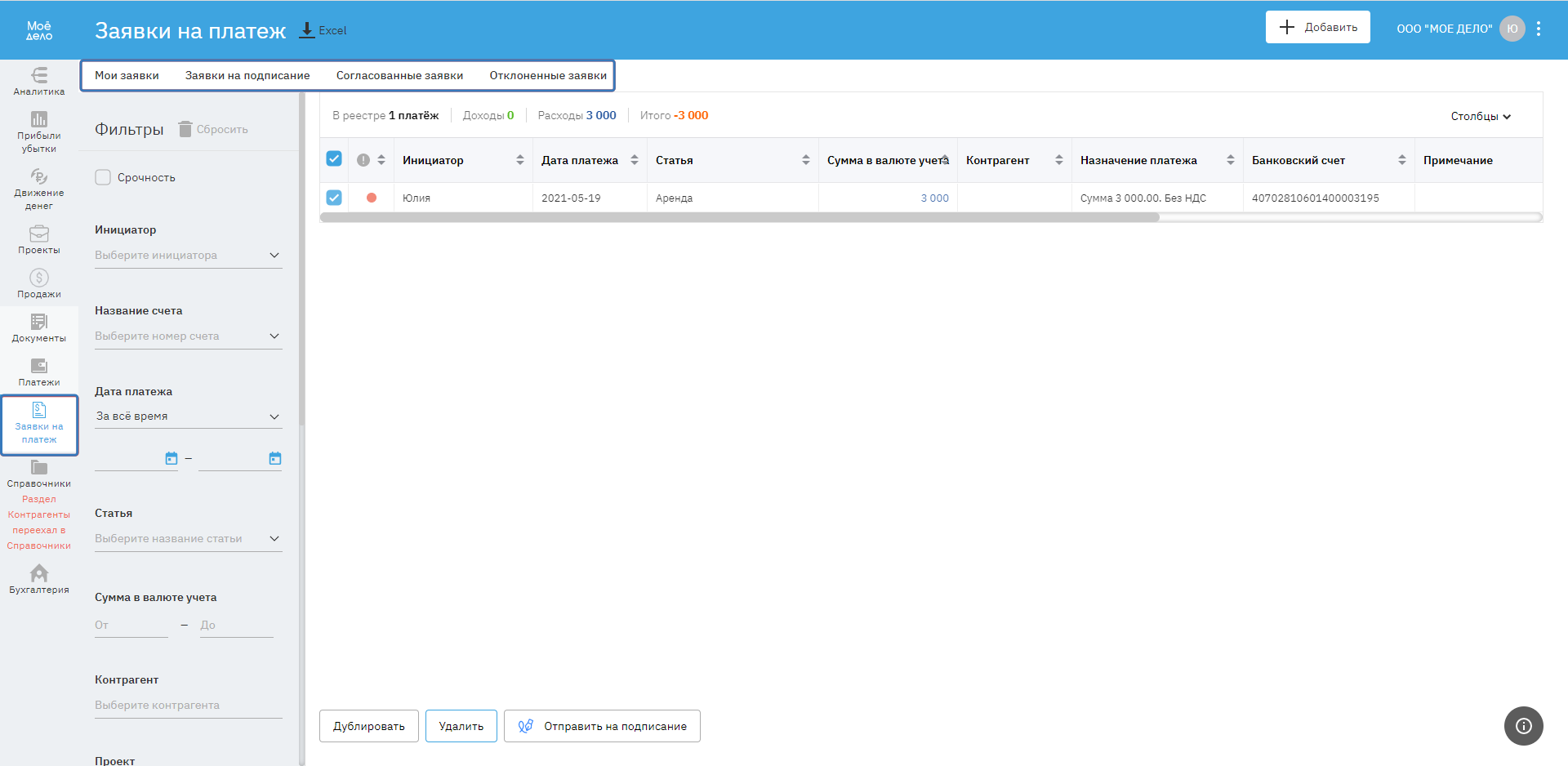 У инициатора заявки на платёж будет отражена информация о заявке в разделе «Согласованные заявки».