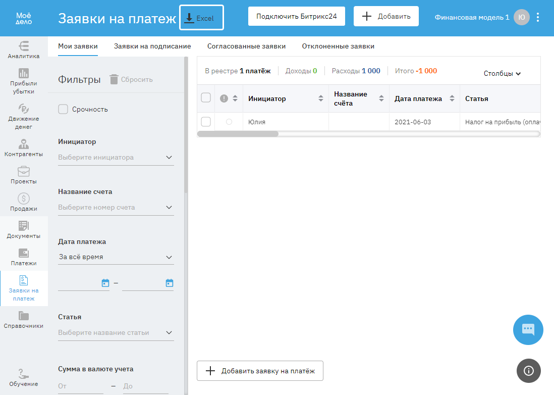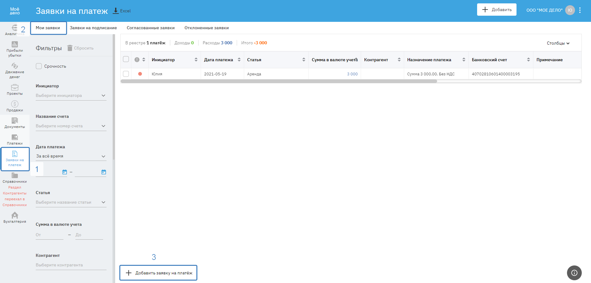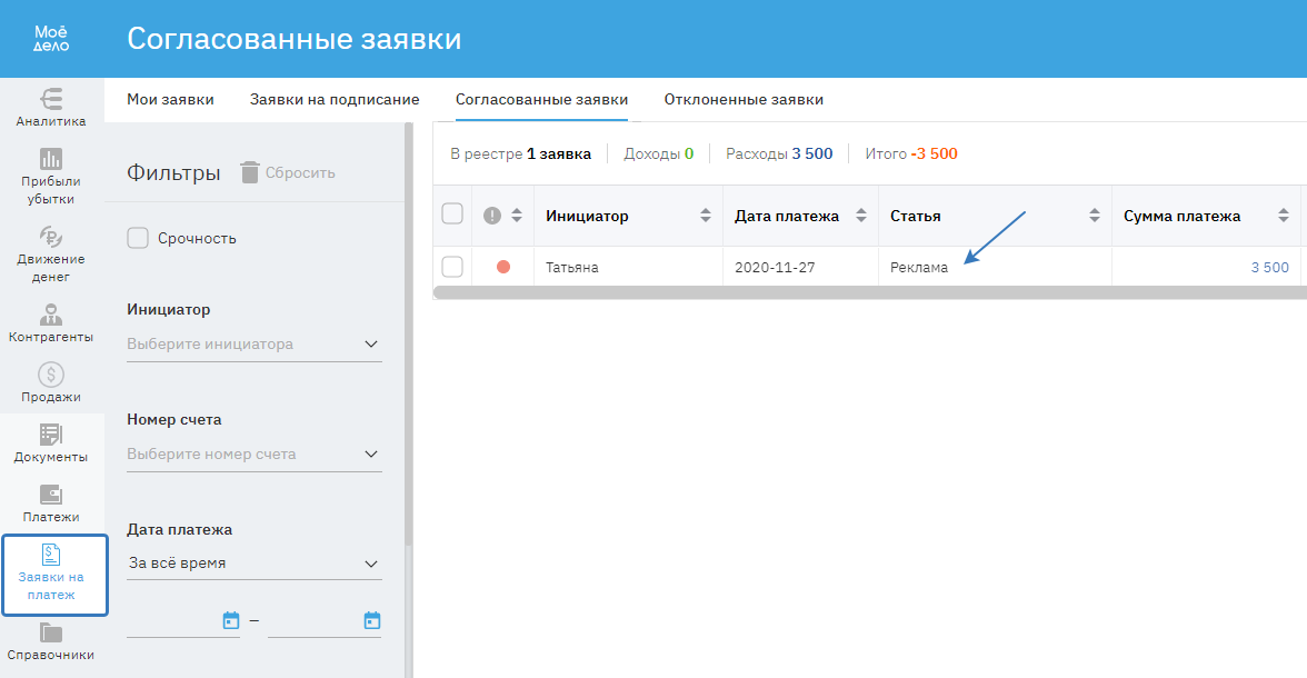 Согласованная заявка попадает в платежи в отчёте ДДС.