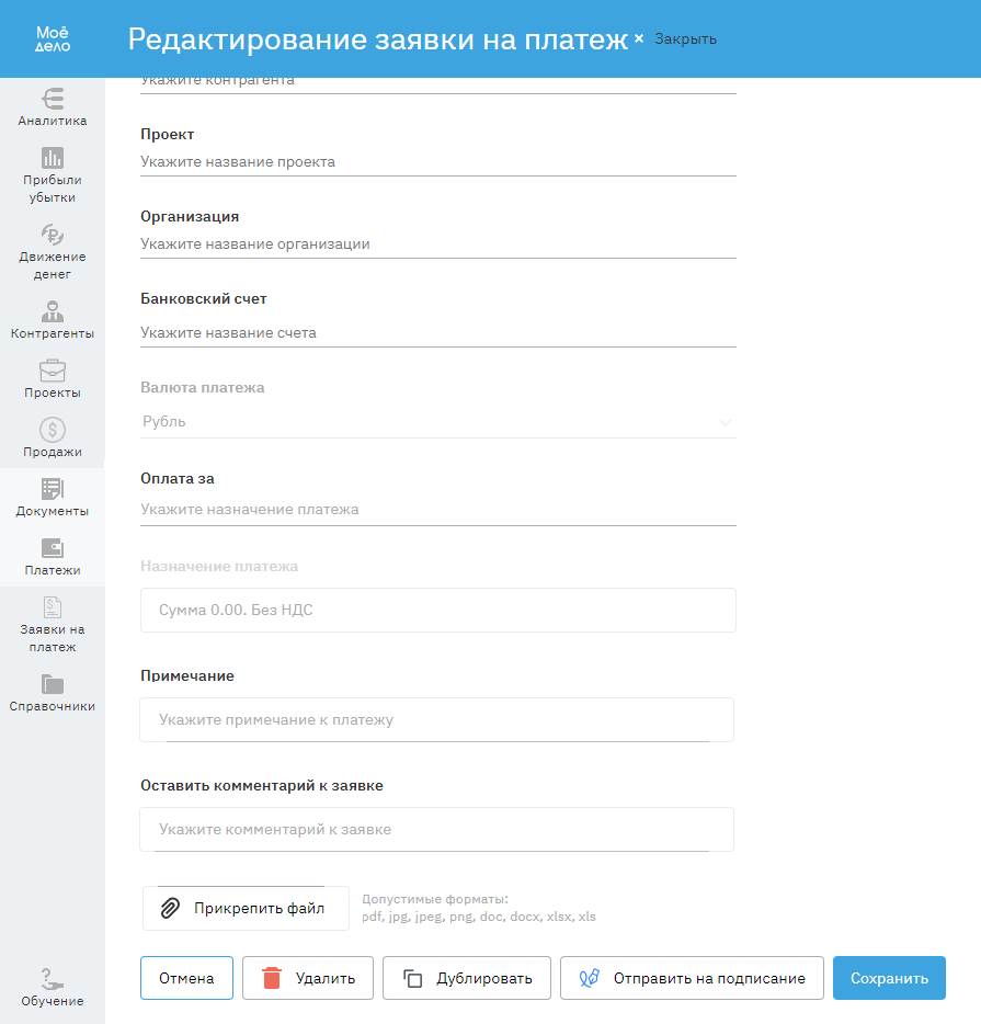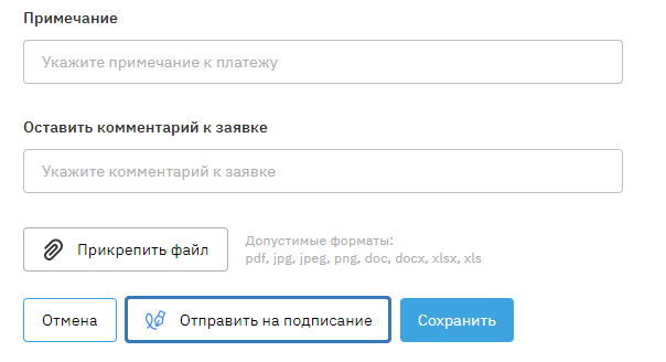 В окне редактирования вы можете прикрепить файл, дублировать заявку, сохранить или отправить на подписание: