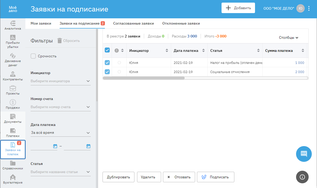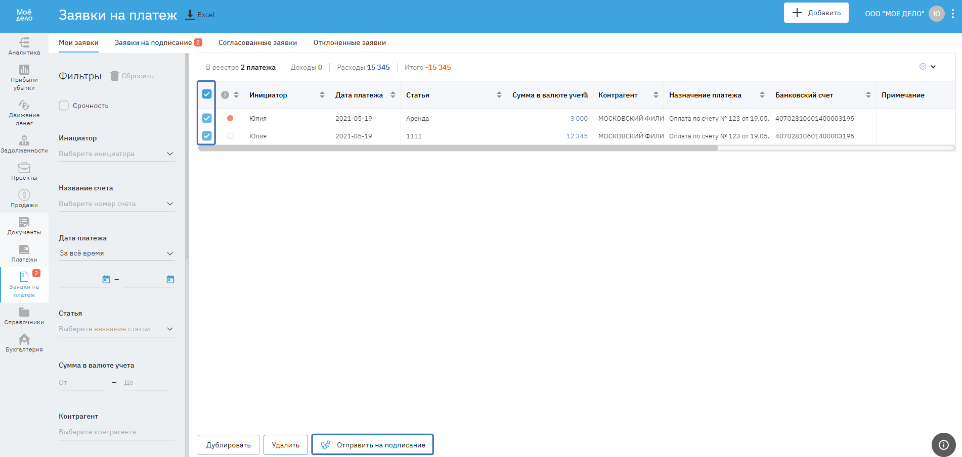Если заявки уже были созданы ранее, выберите их галками и нажмите на кнопку «Отправить на подписание»: