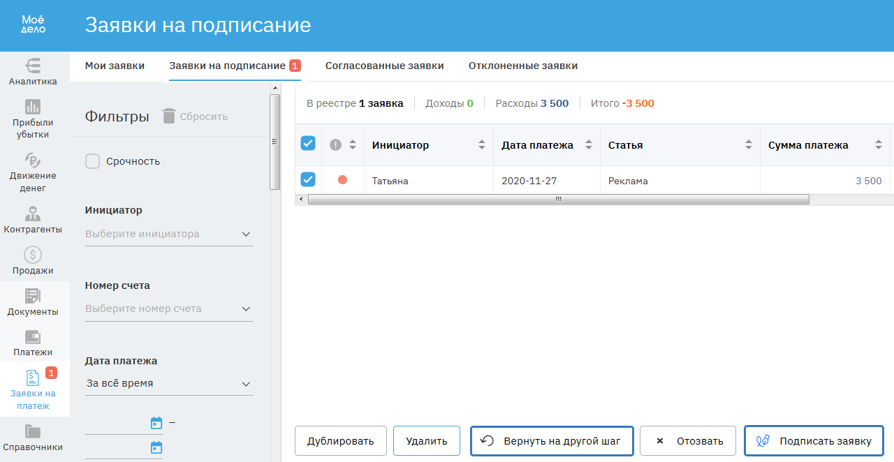 Далее заявка перейдет на подпись пользователям, которые были указаны в шаблоне.