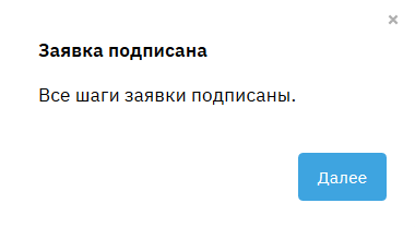 После прохождения всех этапов, указанных в шаблоне заявки пользователю, который поставил подпись последним - будет показано сообщение.