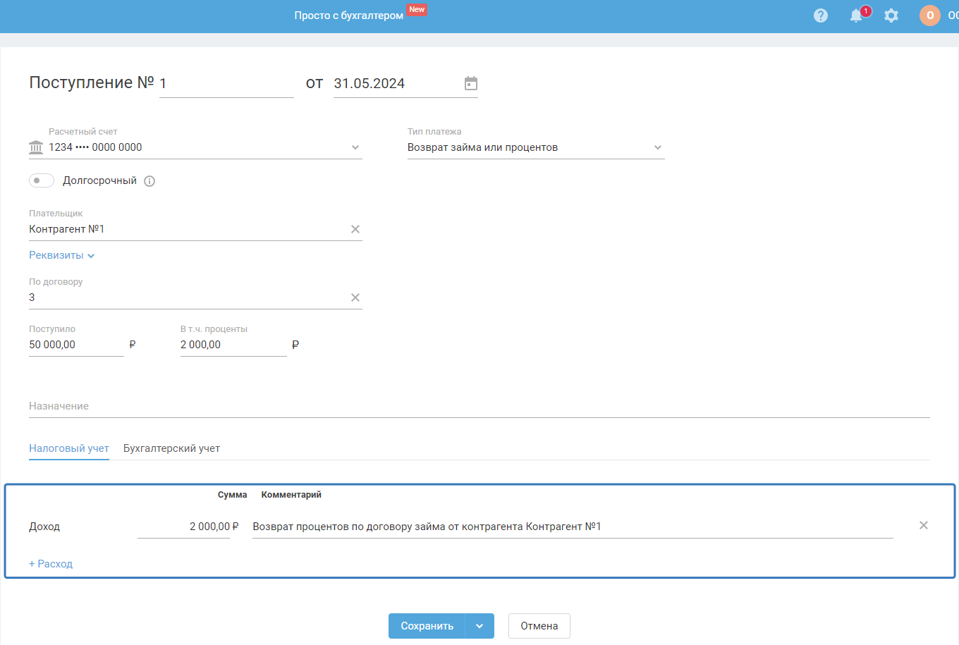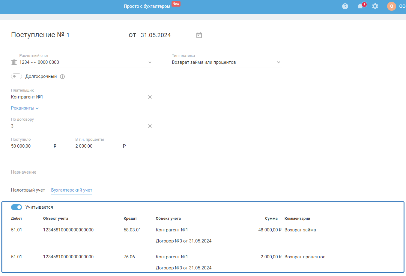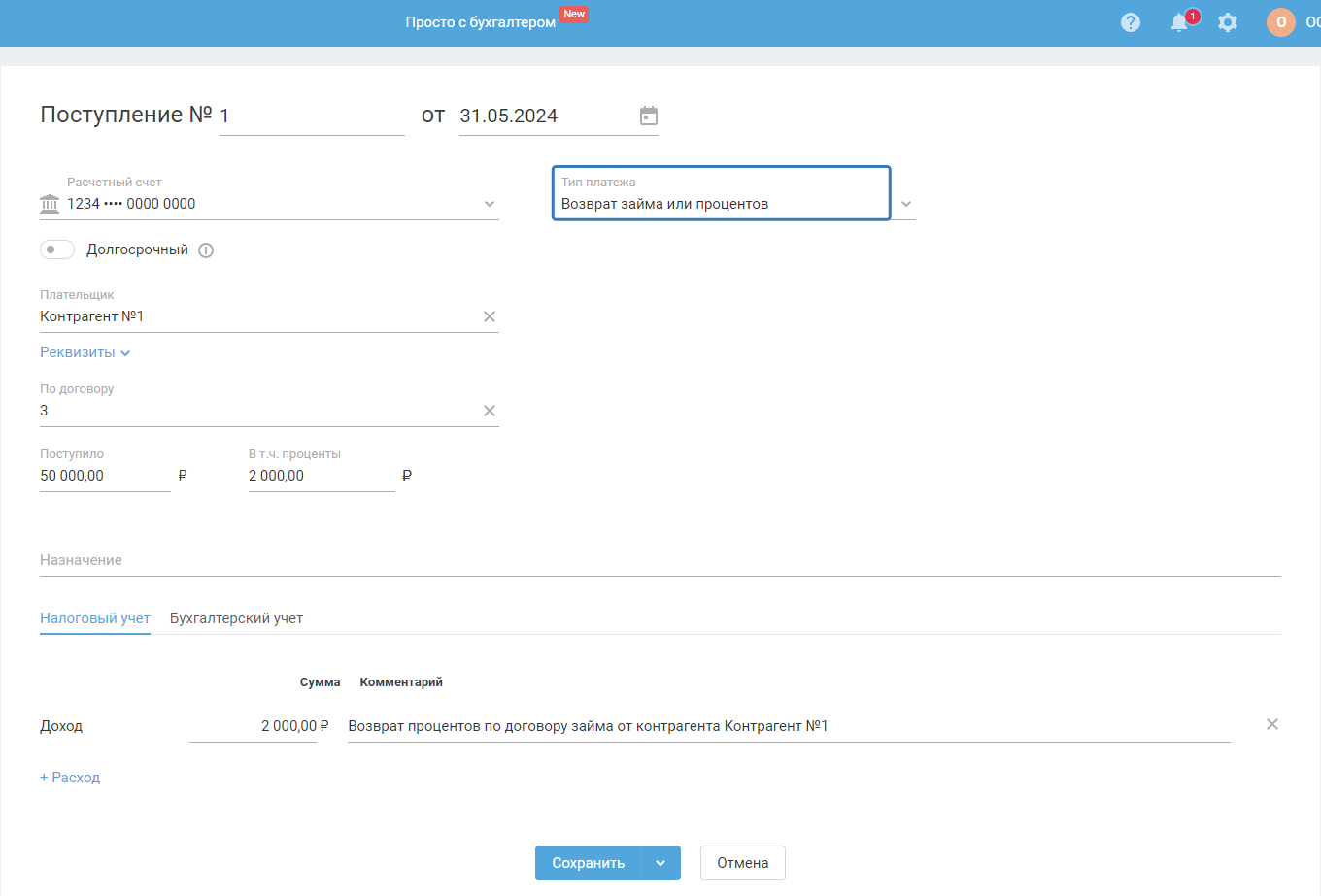В разделе «Деньги» создайте поступление с типом «Возврат займа или процентов»:
