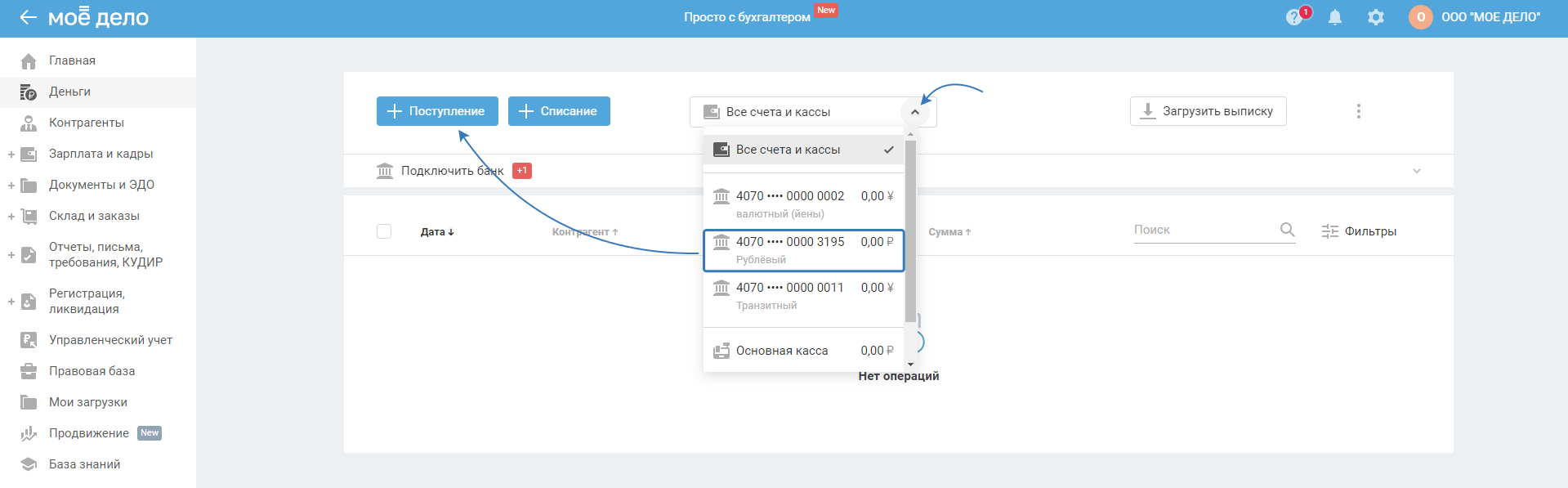 В разделе «Деньги» нажмите на поле «Все счета и кассы» и выберите из выпадающего списка рублёвый расчётный счёт, на который поступили денежные средства от продажи валюты: