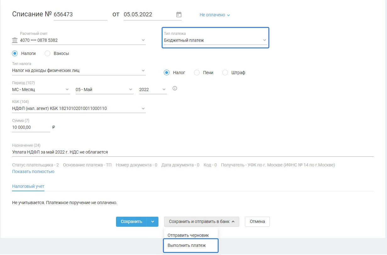 Функционал доступен для пользователей сервиса с подключенной интеграцией с банком Сбербанк. В разделе «Деньги» при создании документа на списание с типом «Бюджетный платёж». После заполнения обязательных полей нужно нажать на кнопку «Сохранить и отправить в банк», после чего выбрать пункт «Выполнить платёж»: