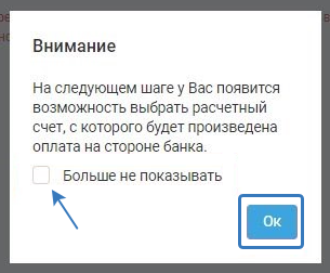 Если у вас в личном кабинете сервиса два или более расчётных счетов с подключенной интеграцией с банком Сбербанк, то после нажатия на кнопку «Выполнить платёж» вы получите сообщение о том, что расчётный счёт, с которого будет произведена оплата, выбирается на следующем шаге – на странице подтверждения платежа.
